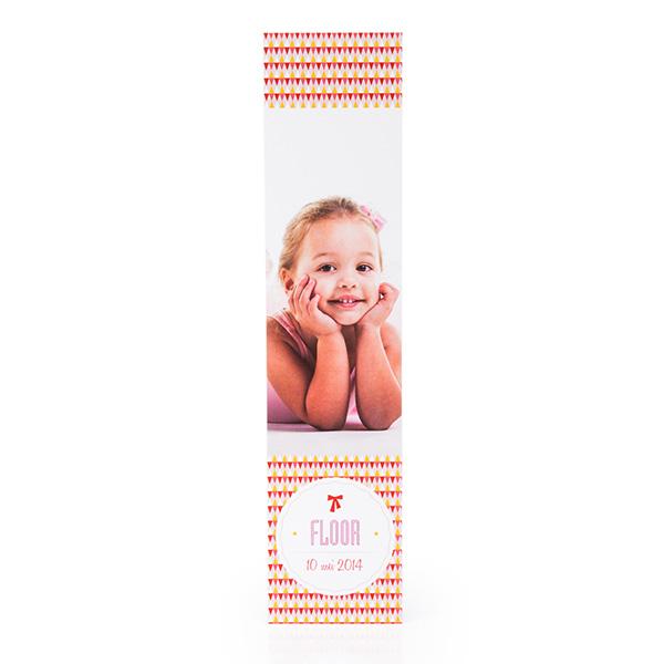 Bladwijzer met illustratie haarlint/strikje. Dit communiebedankje voor communie of lentefeest is makkelijk online aanpasbaar. Plaats zelf je eigen foto en verander tekst en kleuren. Je kan ook een communiekaartje of tafeldecoratie in dezelfde stijl online ontwerpen en bestellen.