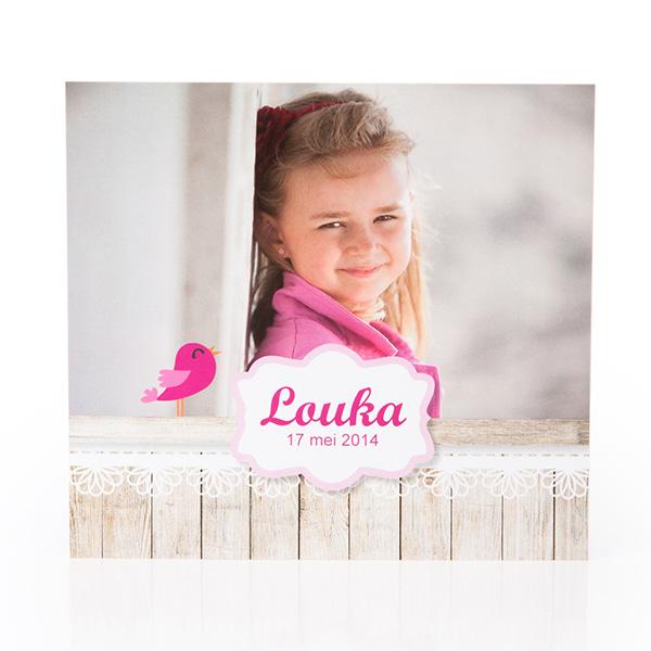 Mooie fotokaart met houtmotief en schattig vogeltje. Dit communiekaartje voor communie of lentefeest is makkelijk online aanpasbaar. Plaats zelf je eigen foto en verander tekst en kleuren. Je kan ook een communiebedankje of tafeldecoratie in dezelfde stijl online ontwerpen en bestellen.