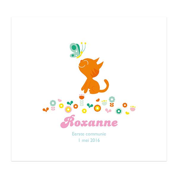Dit communiekaartje voor communie of lentefeest is makkelijk online aanpasbaar. Plaats zelf je eigen foto en verander tekst en kleuren. Je kan ook een communiebedankje of tafeldecoratie in dezelfde stijl online ontwerpen en bestellen.