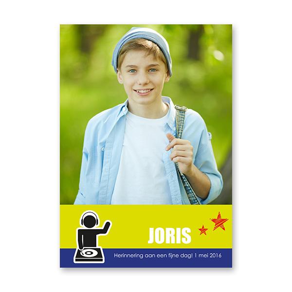 Een feestbeest A3 poster met dj thema. Dit communiebedankje voor communie of lentefeest is makkelijk online aanpasbaar. Plaats zelf je eigen foto en verander tekst en kleuren. Je kan ook een communiekaartje of tafeldecoratie in dezelfde stijl online ontwerpen en bestellen.
