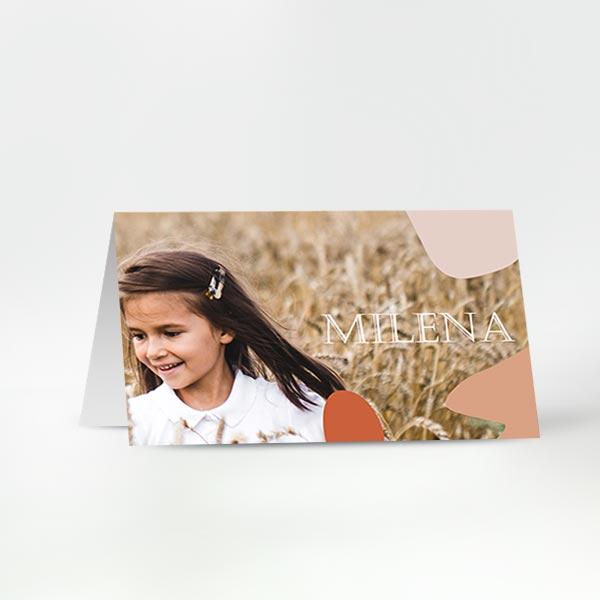 Een warme/zacht tafelkaartje met vlekjes in aardetinten. Dit tafeldecoratie voor communie of lentefeest is makkelijk online aanpasbaar. Plaats zelf je eigen foto en verander tekst en kleuren. Je kan ook een communiekaartje of communiebedankje in dezelfde stijl online ontwerpen en bestellen.